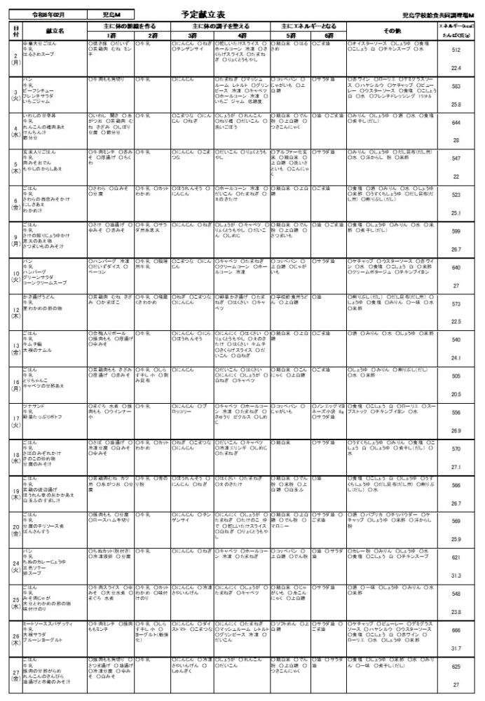 2月 予定献立表 Mコース
