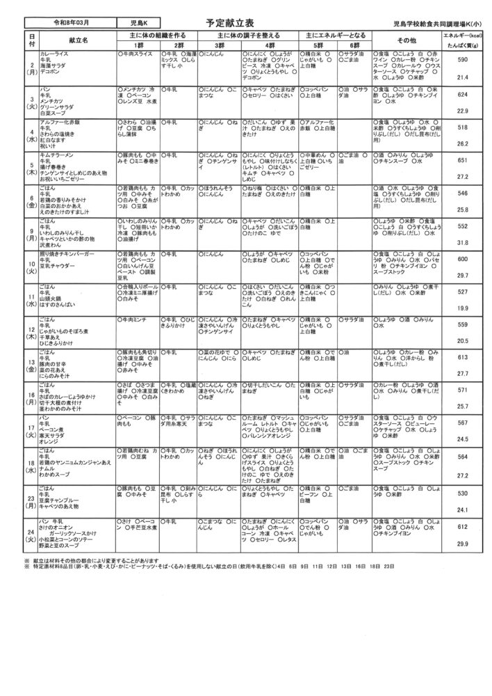 3月 予定献立表 Kコース(小学校)