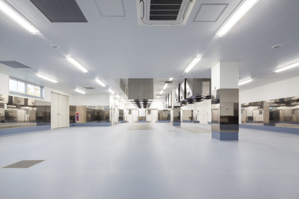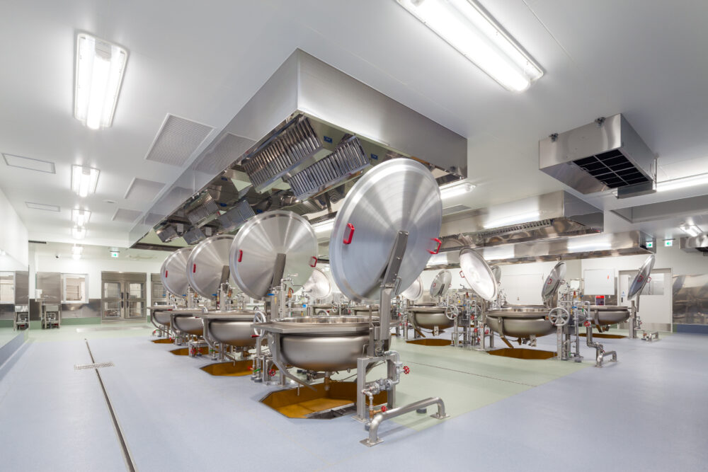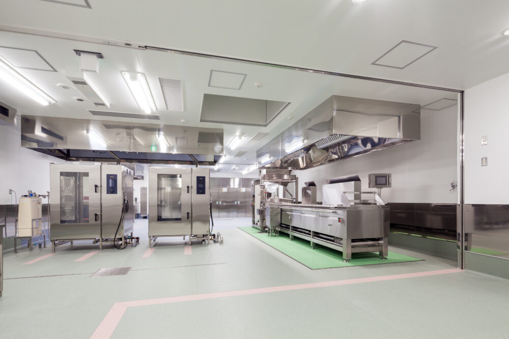 スチームコンベクションオーブンや回転釜で加熱した食材を真空冷却機で急速冷却します。温度管理された室内で、和え物を調理します。
