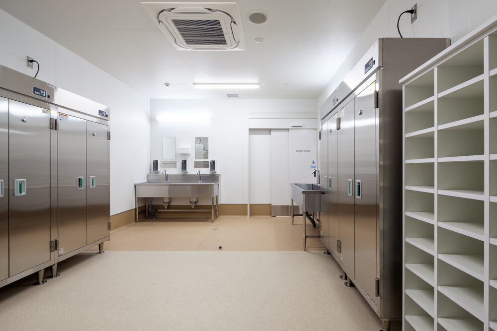 調理室に入室する前に、専用靴に履き替えます。着衣等に付着している毛髪やほこり等をエアシャワーで除去し、手洗いをします。