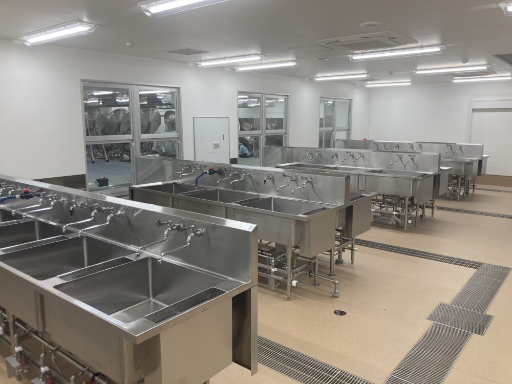 野菜や果物類の洗浄等の下処理を行います。生のままで提供する果物類は専用の下処理ラインを設け、他の野菜との交差汚染を防止します。